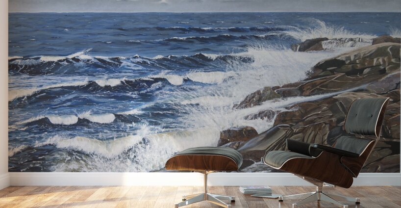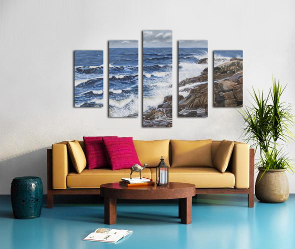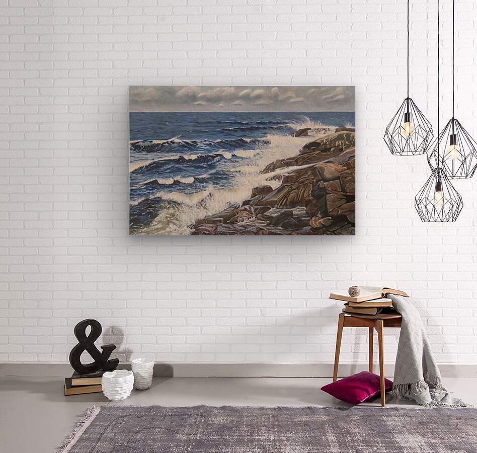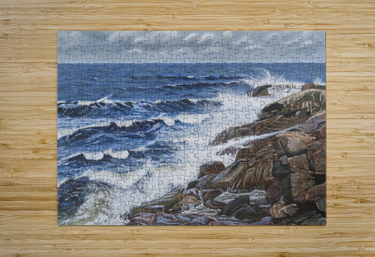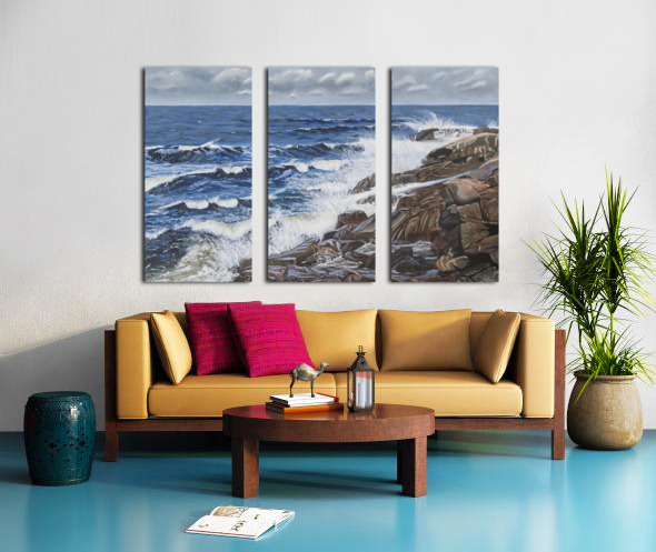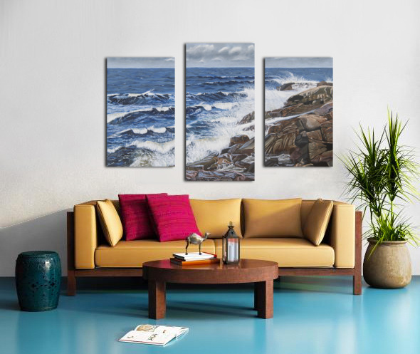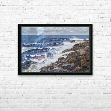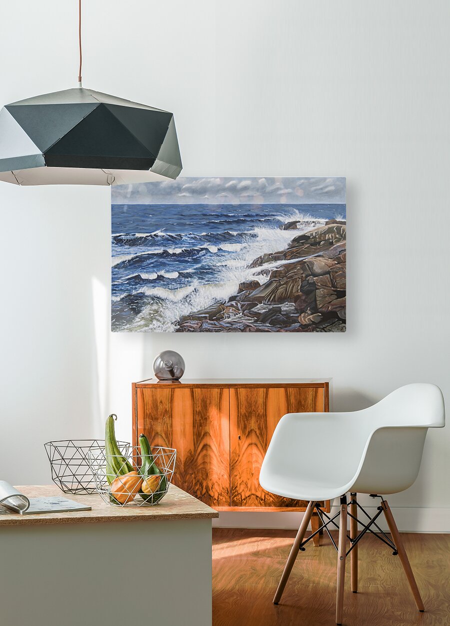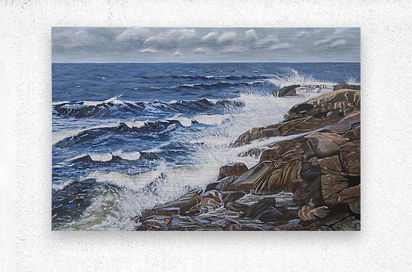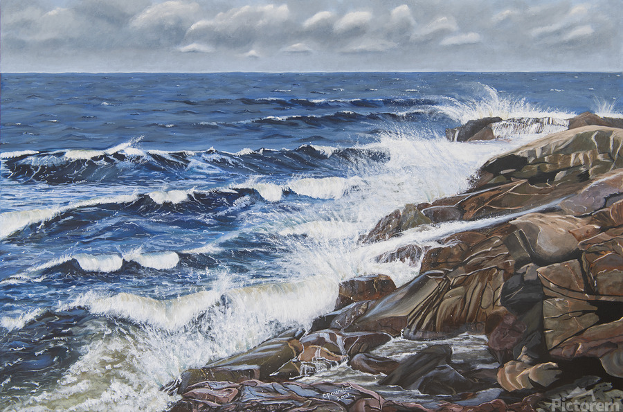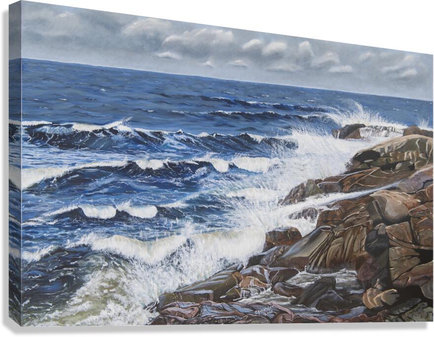 This painting reveals the powerful ability of the sea to calm us when we need peace and tranquility to weigh in on our lives. Listening to the waves splashing on the rocks, the wind increasing and the approaching clouds remind us of the awesome power of nature. Black Brook Cove, Cape Breton, Nova Scotia.