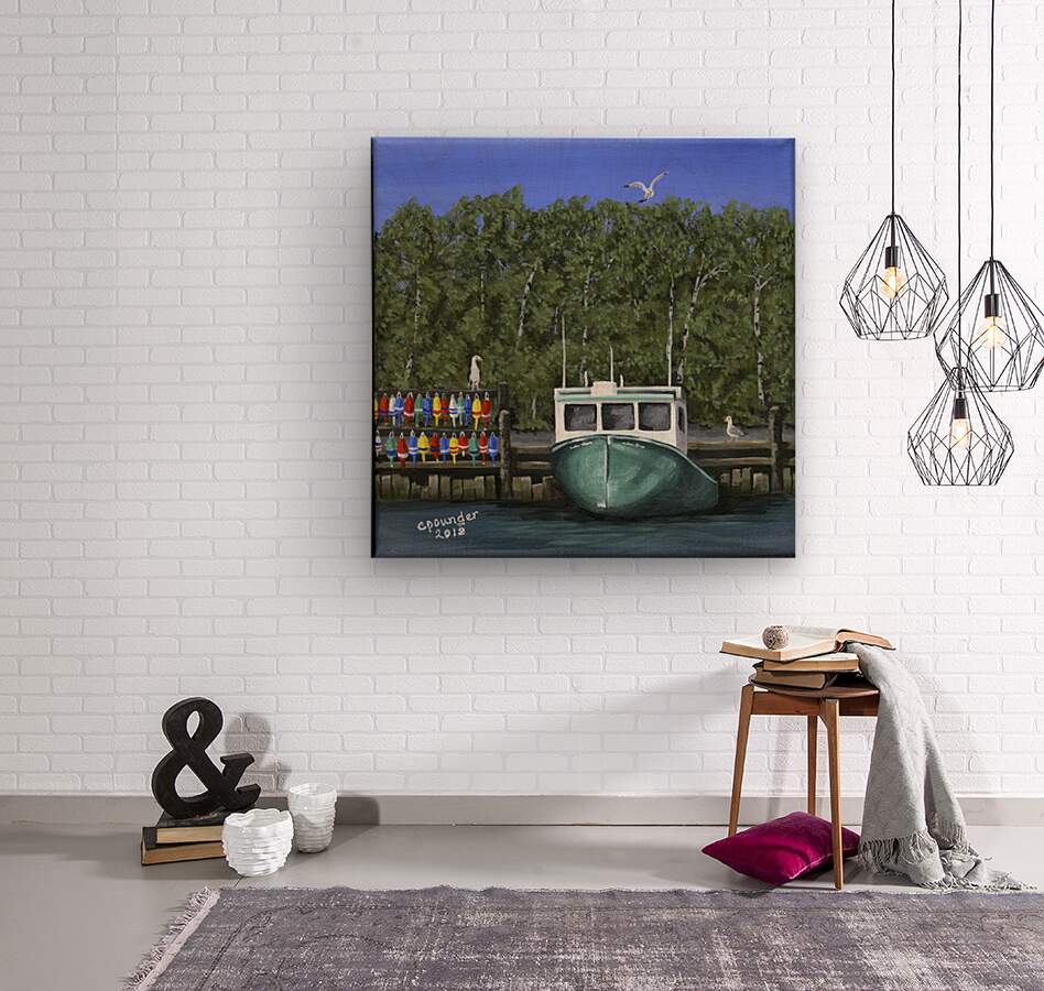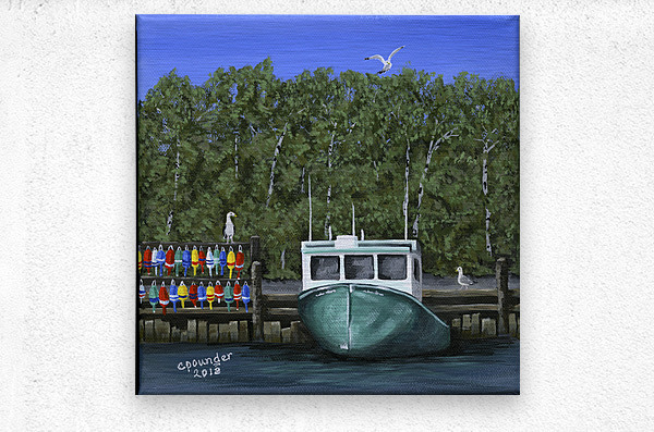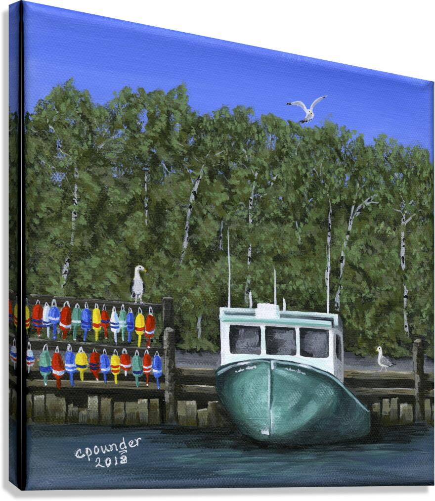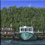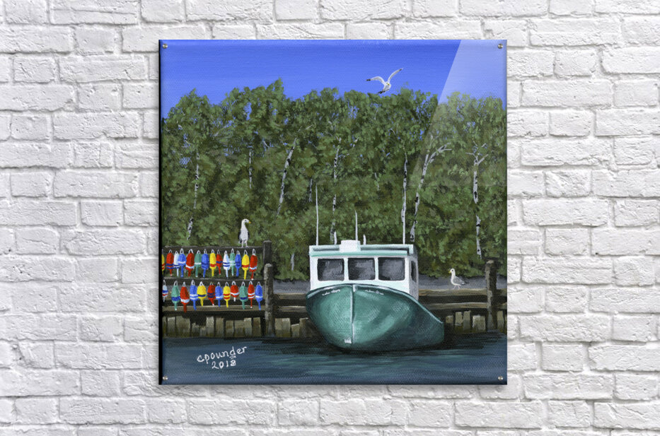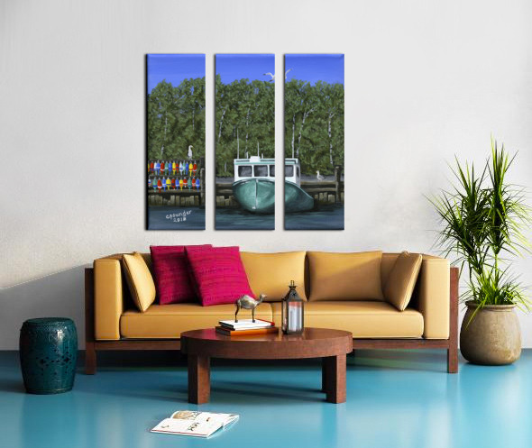 ‘Seas the Day’ was inspired by the local fishing boat harbours around the North Shore area of Nova Scotia. This scene is loosely based on the boats in the Barrachois Harbour near Tatamagouche, a very pretty, vibrant village situated on the Northumberland Straight.